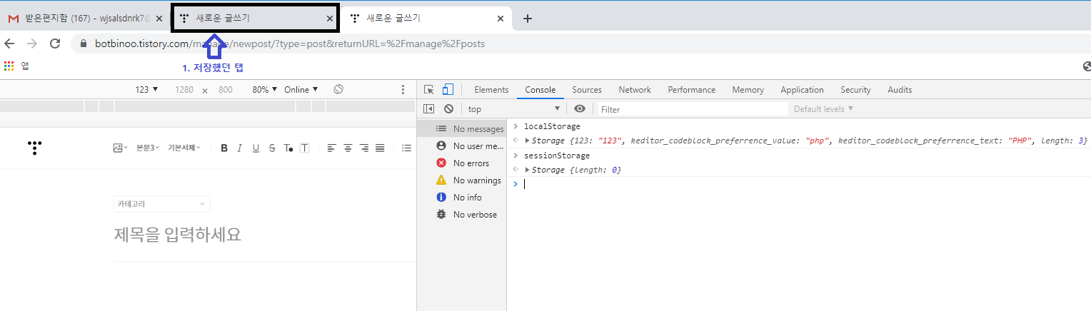 이제 다른 Tab에 동일한 주소에서 콘솔에 값들이 존재하는지 확인해보자.