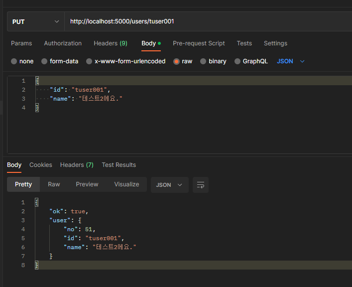 put은 HTTP method 로 수정을 나타낸다.put은대체, 교체의 의미를 갖는 수정이고patch는 대체는 아니고일부 속성만 변경되는 것을 의미한다.id는 사용자를 식별하는 키로써path-variable경로상 변수로 둘 수도 있다. 주로 REST 에서 권장하는 방식이다.name은body에서 받고 있다. 이런식으로 파라미터 받는 방식을 다양하게 둘 수 있다.
