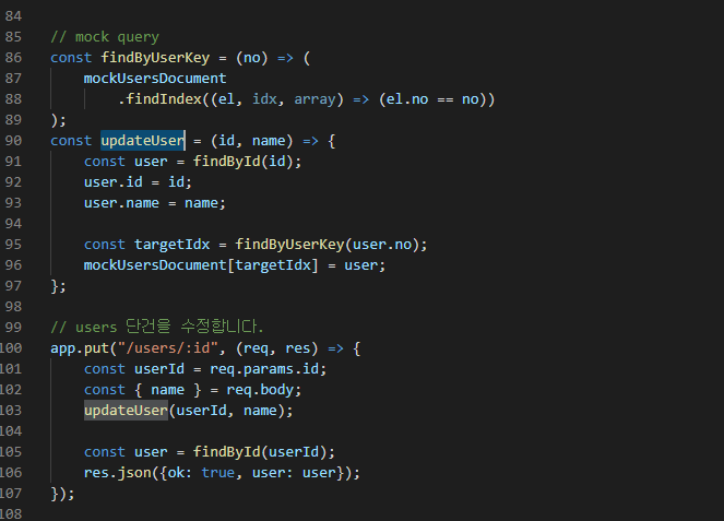 findByUserKey는 배열의 인덱스 값을 구하는 로직으로 실 디비 연동시 필요가 없어 삭제해도 무방하다.updateUser에서 회원의 아이디와 이름을 모두 교체한다.