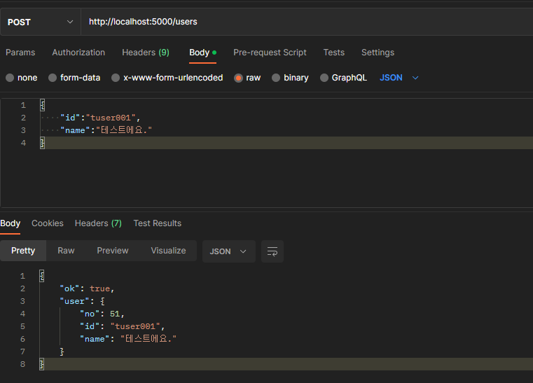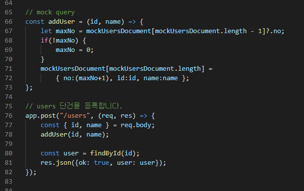 bodyjson 을 사용하기 위해json을use로 두었다.urlencoded사용을 위해 코드가 추가되었다.addUser의 배열 추가 로직은array.push로 작성되어도 동일하다.