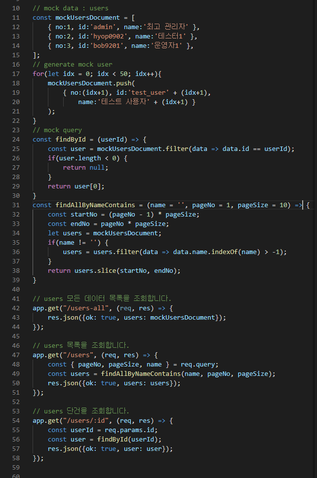 mockUsersDocument를 통해 mock 객체를 만들고 데이터를 넣어 연습해보자. - 이제 가상의 모의 디비 데이터가 준비되었으니 데이터를 조회하는 로직을 구현해보자