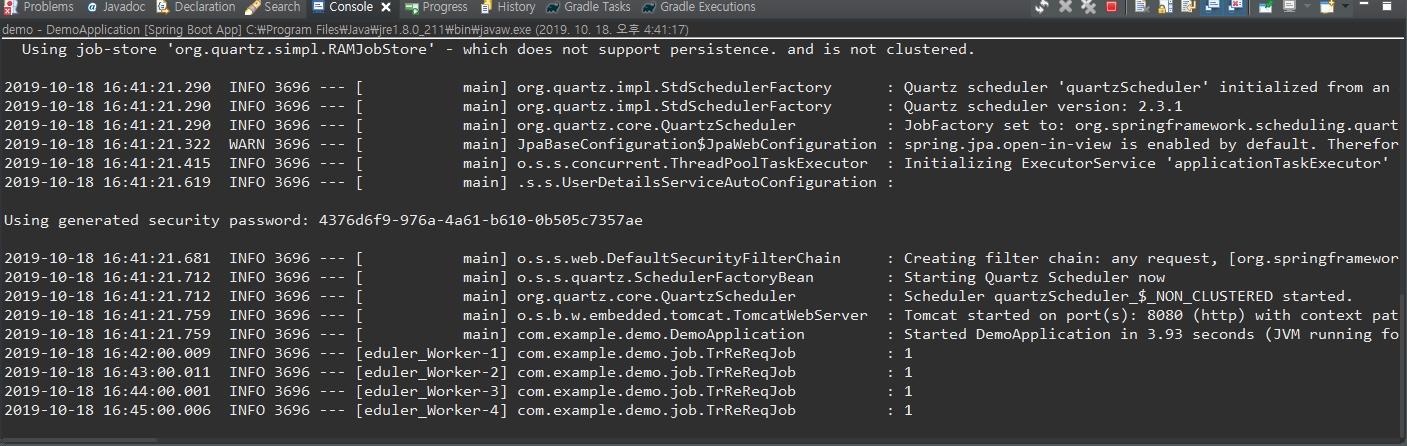 1) 로그를 보면 알겠지만, 소스상 매분 0초마다 잡이 잘 실행되고 있음을 알 수 있다.